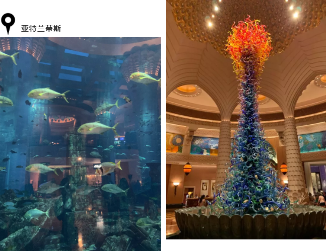 酒店設(shè)有中東最大型的水上樂園和巨型水族館,水族館飼養(yǎng)了六萬五千條魚。