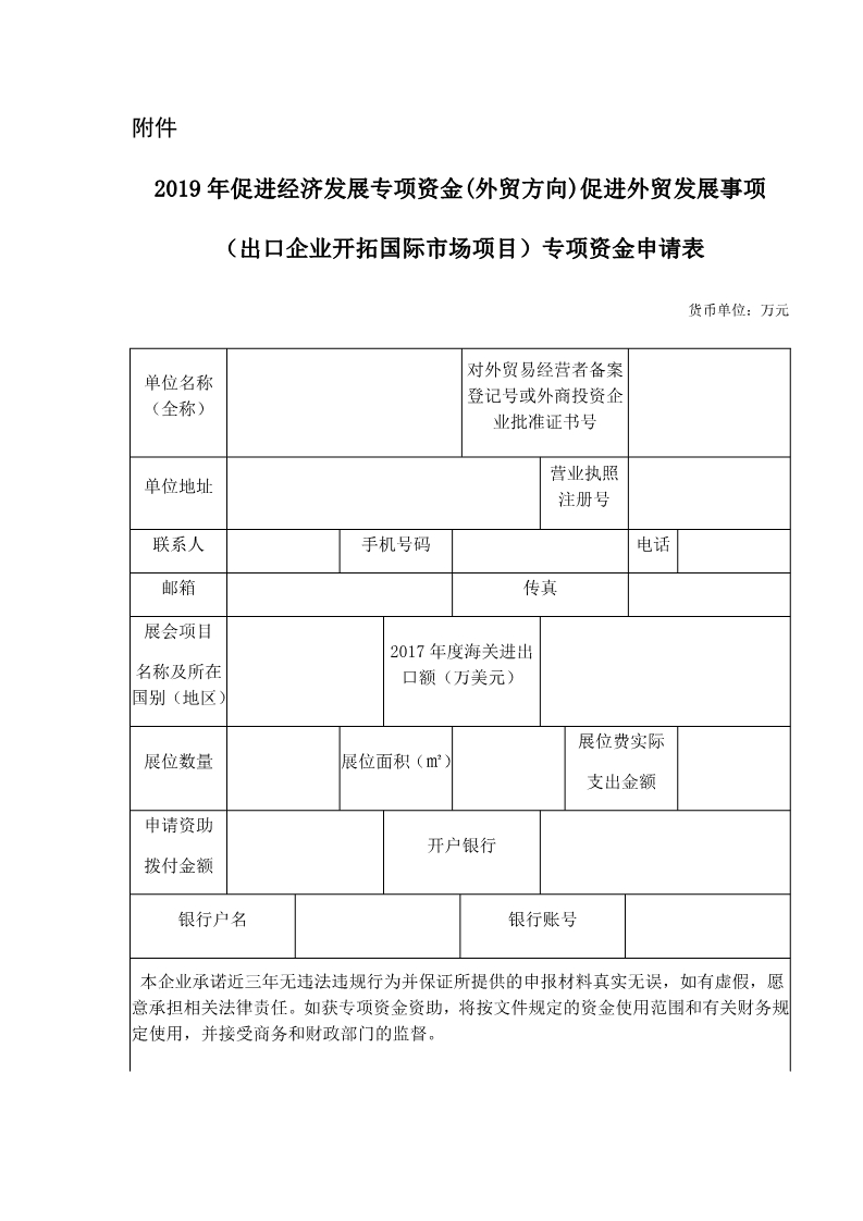 附件:2019年促進(jìn)經(jīng)濟(jì)發(fā)展專(zhuān)項(xiàng)資金(外貿(mào)方向)促進(jìn)外貿(mào)發(fā)展事項(xiàng)(出口企業(yè)開(kāi)拓國(guó)際市場(chǎng)項(xiàng)目)專(zhuān)項(xiàng)資金申請(qǐng)表