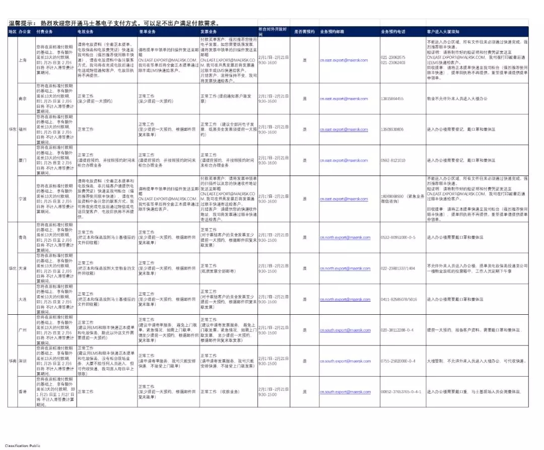 馬士基大中華區(qū)各地辦公室恢復(fù)運營情況請參考下圖,員工的健康和安全是我們工作的 重中之重,因此,絕大部分馬士基員工保持在家遠程辦公。與此同時,我們的柜臺業(yè)務(wù) 仍正常運行,服務(wù)客戶無間斷。我司寧波辦公室所在寫字樓,現(xiàn)正配合當(dāng)?shù)卣? 等待政府復(fù)工審批,為此我們對寧波柜臺服務(wù)設(shè)置了特別的操作流程,詳情請咨詢當(dāng)?shù)?客戶服務(wù)代表。