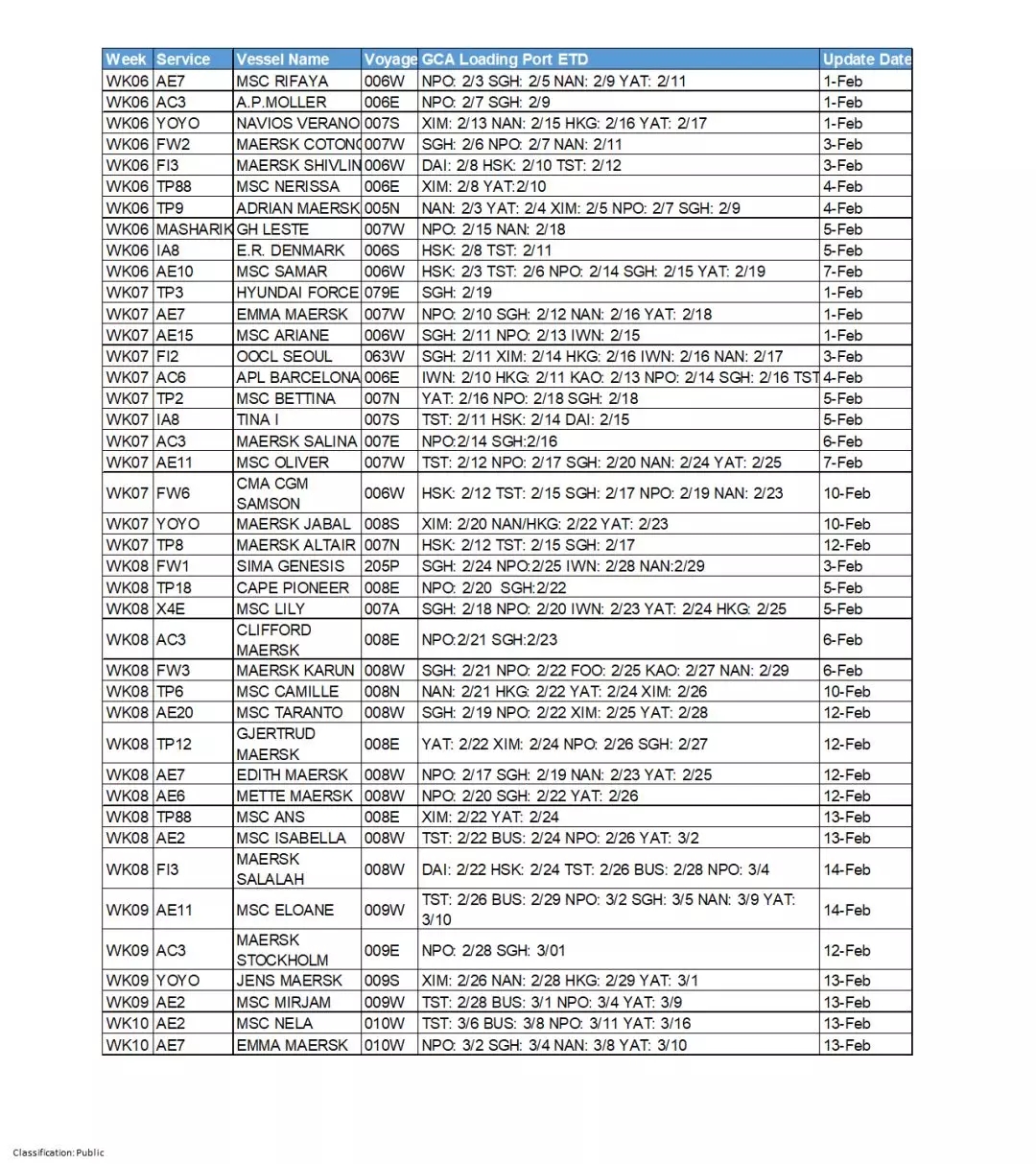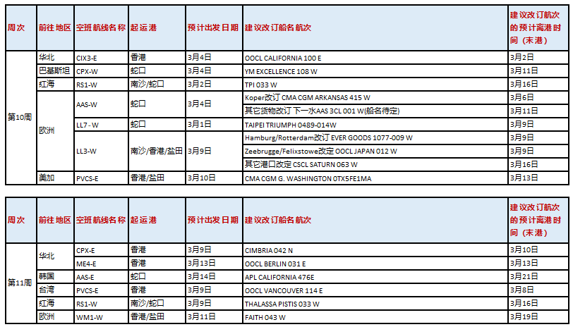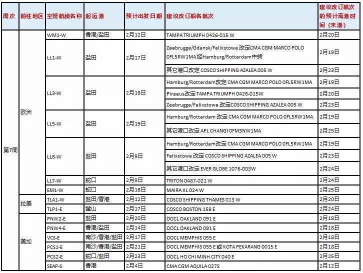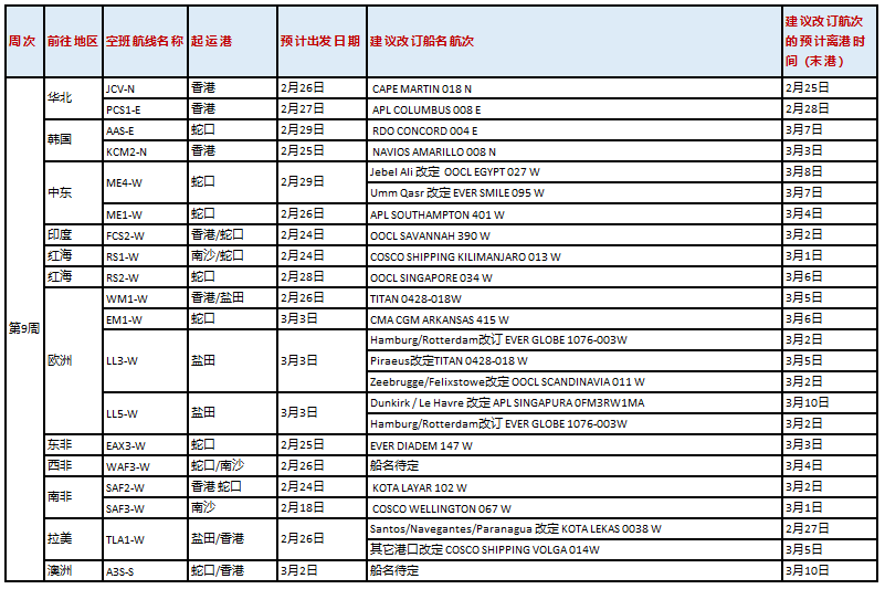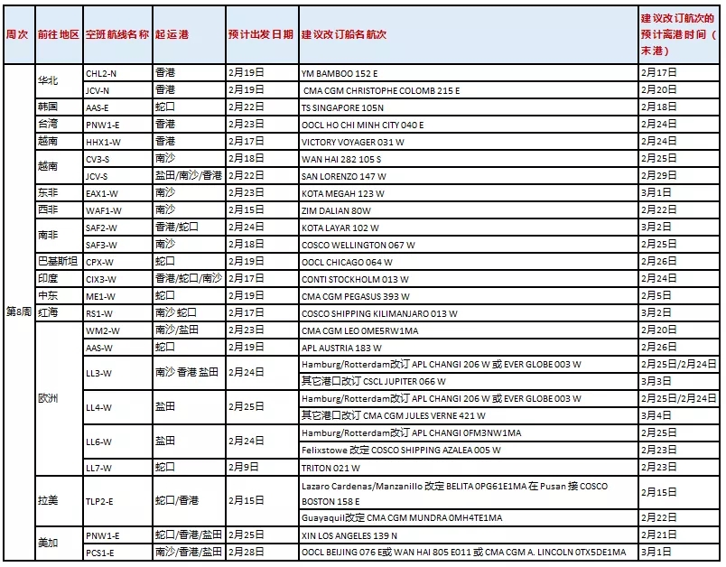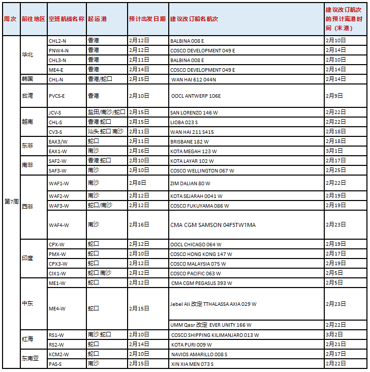 航線方面,受公眾假期延長及后續(xù)需求放緩影響,以下航線船舶將進行調(diào)整,具體安排 如下: