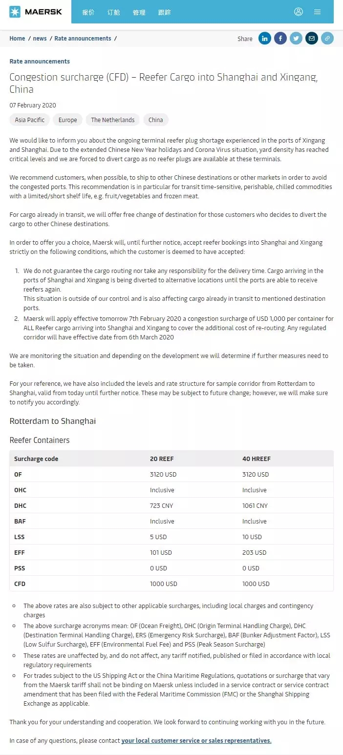 從2月7日起,對進入上海和天津新港的冷藏箱貨物加收每箱1000美元的擁堵費,以支付中心規(guī)劃航線的額外費用,部分航線生效日期為3月6日。