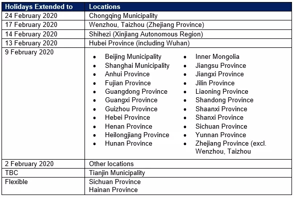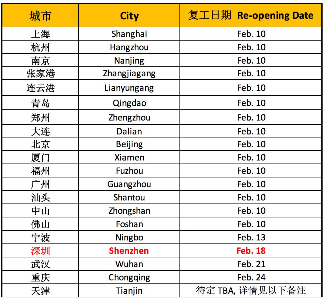 因應(yīng)新冠肺炎疫情,除中國國務(wù)院通告延長春節(jié)假期外,各省市政府也陸續(xù)公布延遲復(fù)工的通知,以減少人員齊聚、控制疫病傳播,對此,本公司配合各地防疫政策公告中國各辦公室復(fù)工動態(tài)如下: