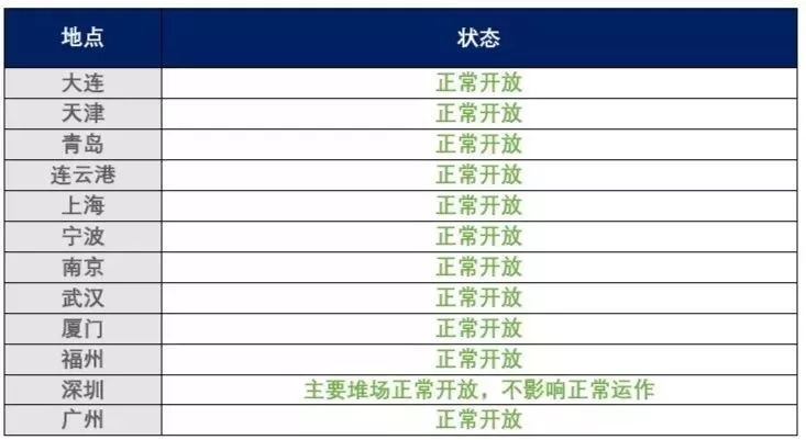 所有海運碼頭堆場正常提供服務(wù),提空柜還重柜均正常進行。所有外堆場均已恢復(fù)運營。