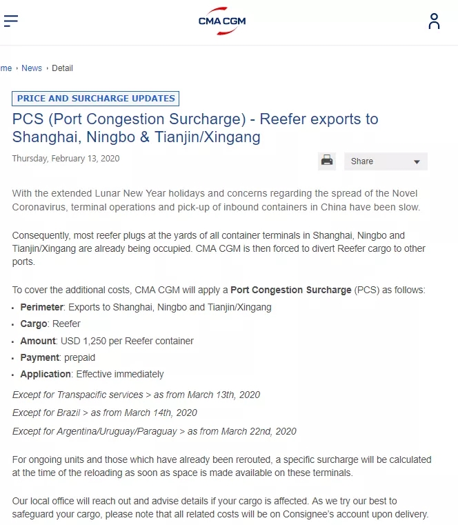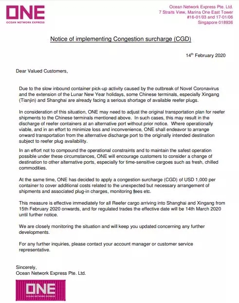 2.從2020年2月12日起,HMM將對所有前往上海、寧波和新港的冷凍箱訂艙收取每箱1000美元的擁堵附加費,以支付不可預(yù)估的轉(zhuǎn)運和在替代港口延長停留時間的額外費用。對于某些特定航線,此附加費將從2020年3月12日起生效。