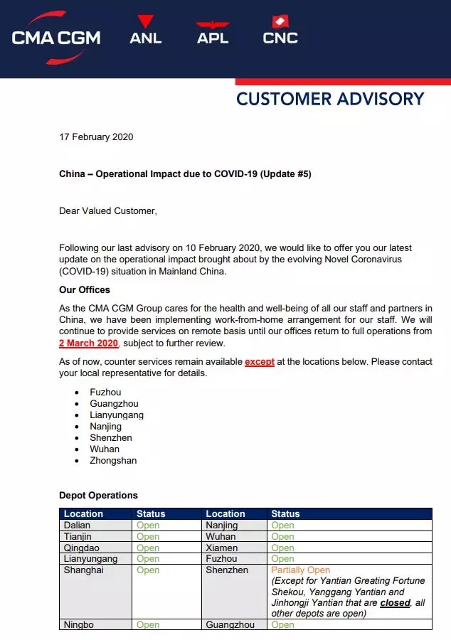 除武漢辦公室還在關(guān)閉中,其他各地區(qū)辦公室都恢復(fù)正常運營!同時馬士基也指出,基于員工的健康和安全的考量,目前絕大部分馬士基員工保持在家遠程辦公。與此同時,馬士基的柜臺業(yè)務(wù)仍正常運行,服務(wù)客戶無間斷。