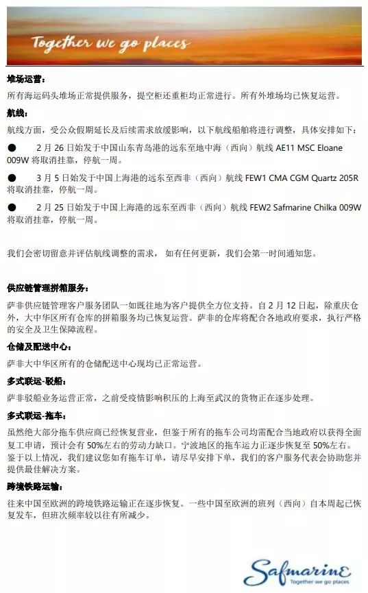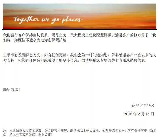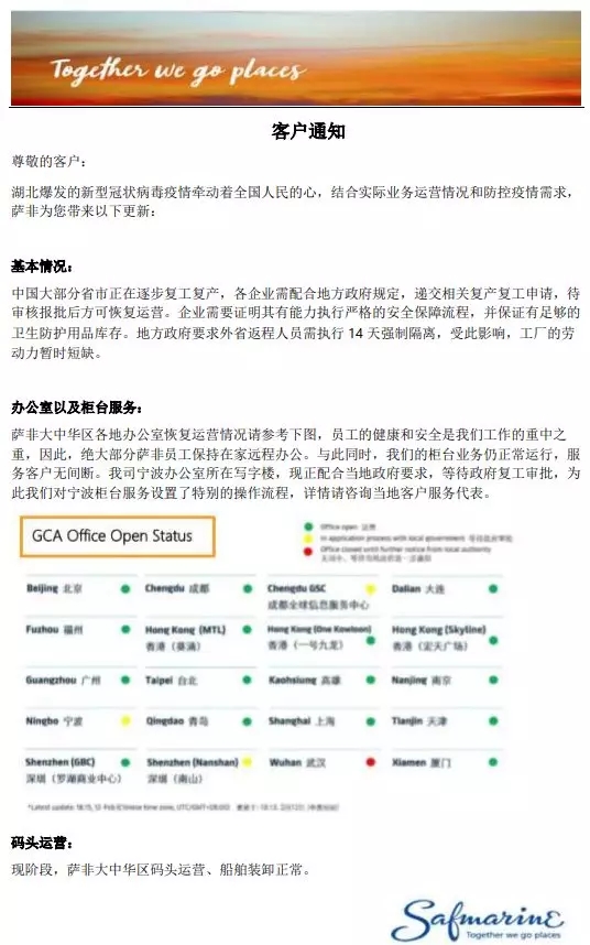薩非航運關(guān)于疫情期間業(yè)務(wù)運營的通知(更新)
