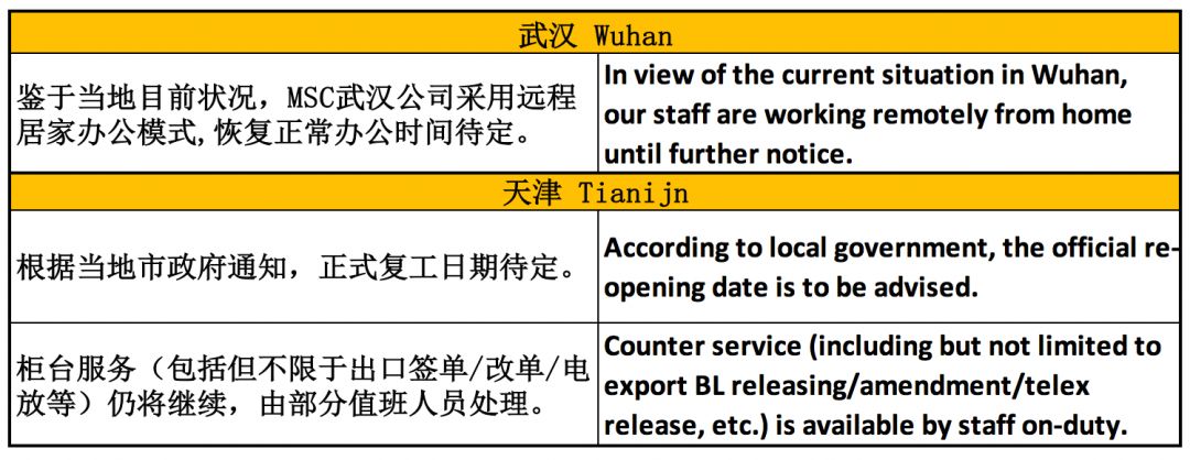 上班的方式,部分員工在辦公區(qū)域工作,部分員工居家連線在崗,為客戶提供必需及時的服務(wù)。由于各地方政府對疫情防控的不同要求,特此更新MSC在中國大陸下述城市的辦公室最新復(fù)工情況: