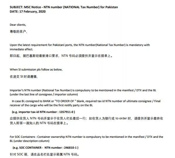 MSC:巴基斯坦-->提單必須提供NTN號碼
