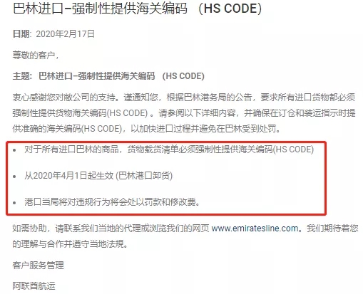 阿聯(lián)酋航運發(fā)布通知:根據(jù)巴林港務(wù)局最新公告,要求所有進口巴林的貨物都必須提供貨物海關(guān)編碼(HS CODE)。具體要求如下: