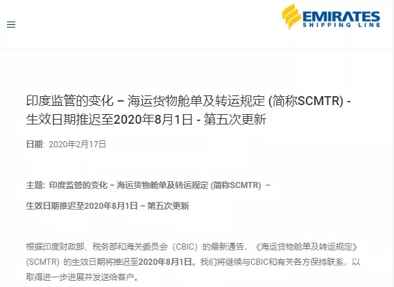 根據(jù)印度財政部、稅務(wù)部和海關(guān)委員會(CBIC)的最新通告,《海運貨物艙單及轉(zhuǎn)運規(guī)定》 (SCMTR) 的生效日期將推遲至2020年8月1日。我們將繼續(xù)與CBIC和有關(guān)各方保持聯(lián)系,以取得進一步進展并發(fā)送給客戶。