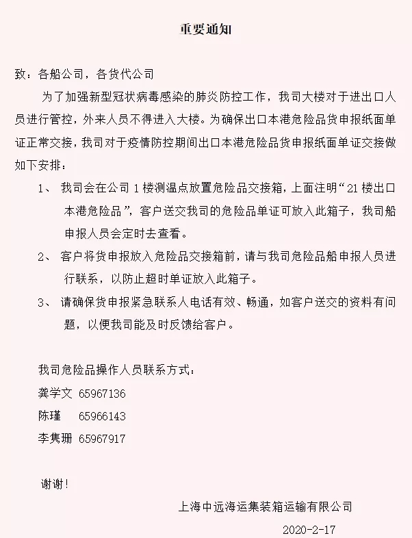 中遠海運出口上海港危險品貨申報交接通知